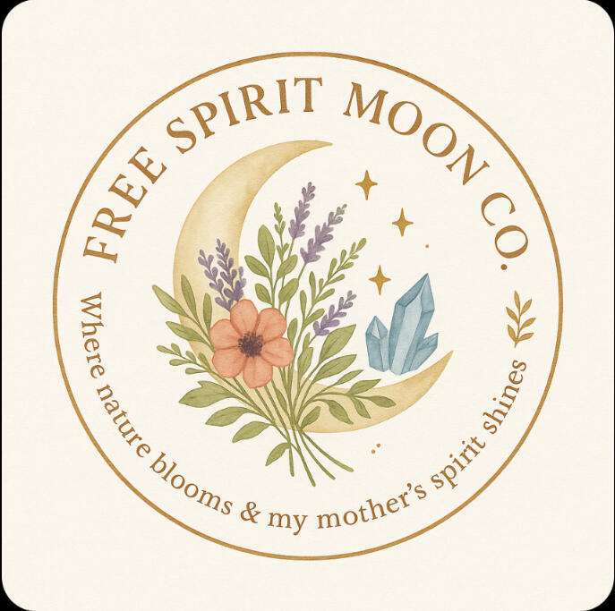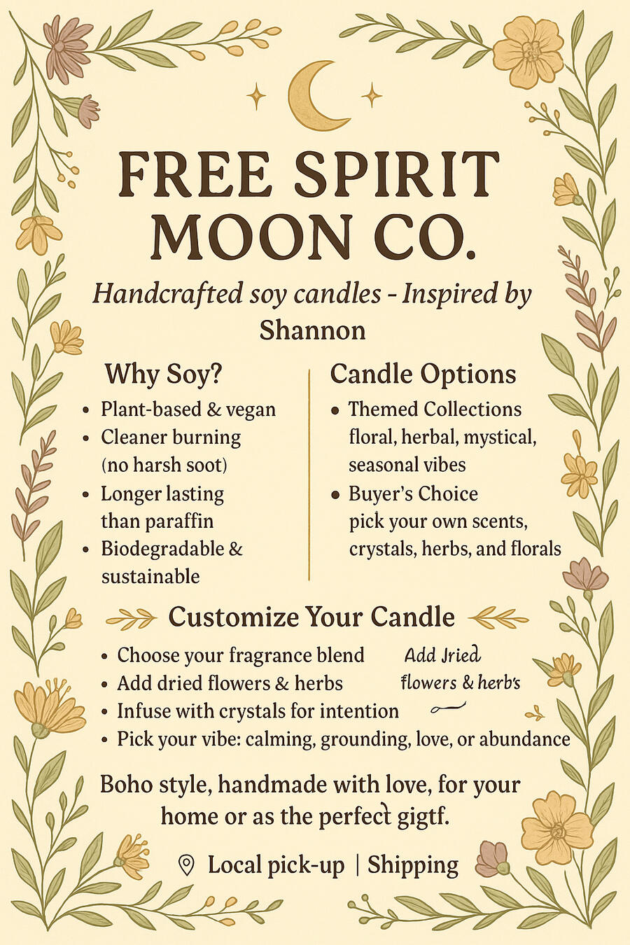 🌙 FREE SPIRIT MOON CO.Where nature blooms & my mother’s spirit shinesHandcrafted soy candles & spiritual creations inspired by Shannon.💫 About the BrandFree Spirit Moon Co. was created in loving memory of Shannon — a free spirit whose light still guides every flame.Each candle is handcrafted with intention, combining soy wax, crystals, and dried flowers & herbs to inspire calm, love, protection, and abundance.🕯️ Why Soy?Plant-based & veganCleaner burning (no harsh soot)Biodegradable & sustainableLonger lasting than paraffinCleaner for your home, safer for your health, and better for the planet.🌿 Dried Flowers & HerbsChoose your vibe:Calming / Cleansing – Lavender, Chamomile, Sage, Rosemary
