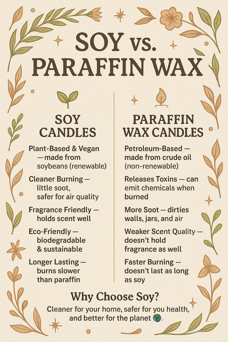 🕯️ Why Soy?Plant-based & veganCleaner burning (no harsh soot)Biodegradable & sustainableLonger lasting than paraffin