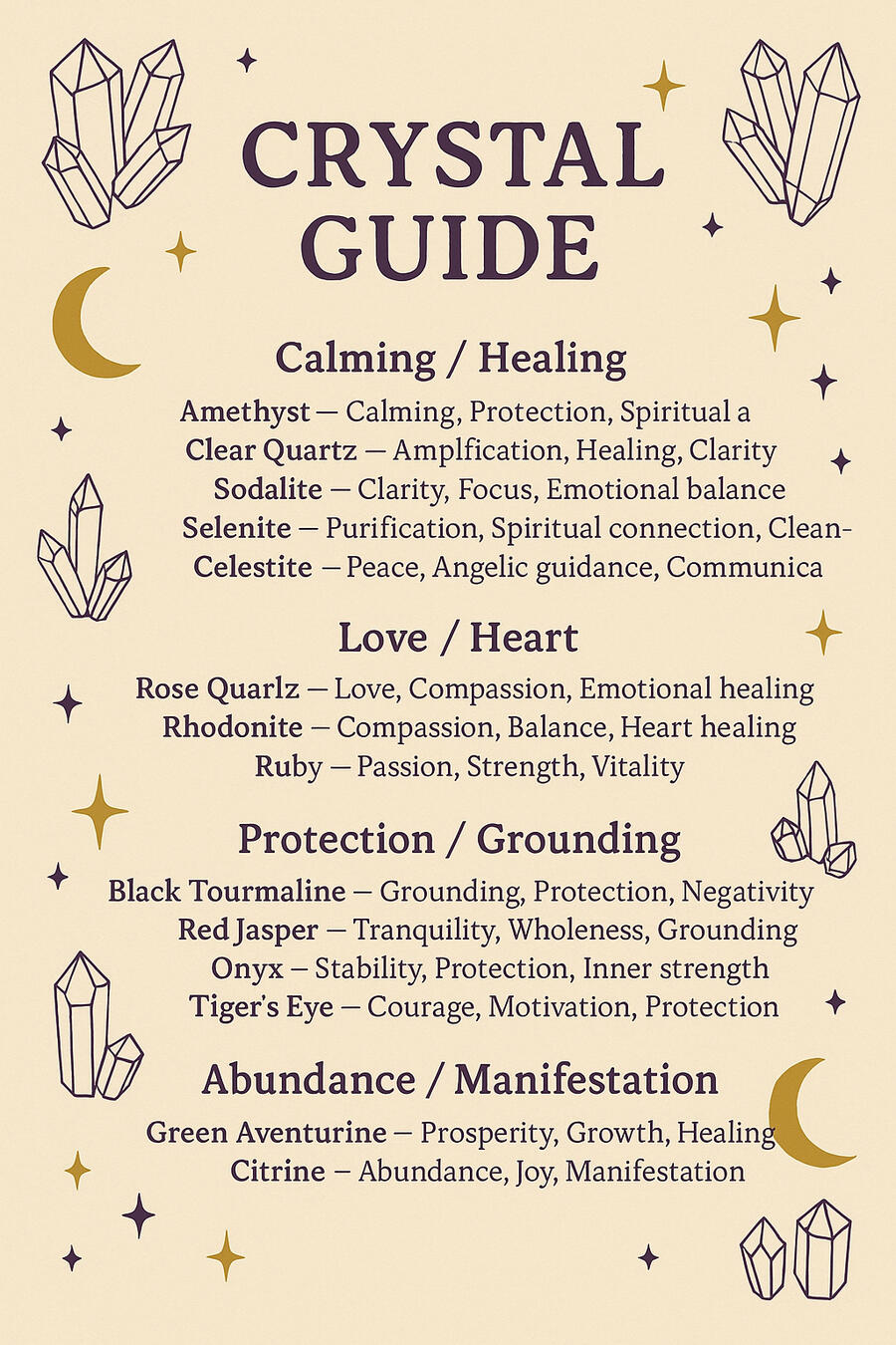 🔮 Crystal GuideInfuse your candle with crystals that amplify your energy:Amethyst – Calm, spiritual protectionClear Quartz – Amplification, healingRose Quartz – Love, compassionBlack Tourmaline – Grounding, negativity shieldCitrine – Abundance & manifestation
