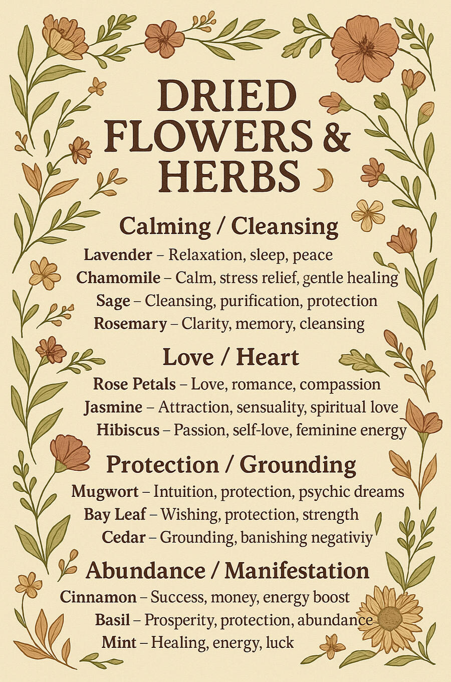 🌿 Dried Flowers & HerbsChoose your vibe:Calming / Cleansing – Lavender, Chamomile, Sage, RosemaryLove / Heart – Rose Petals, Jasmine, HibiscusProtection / Grounding – Mugwort, Bay Leaf, CedarAbundance / Manifestation – Cinnamon, Basil, Mint
