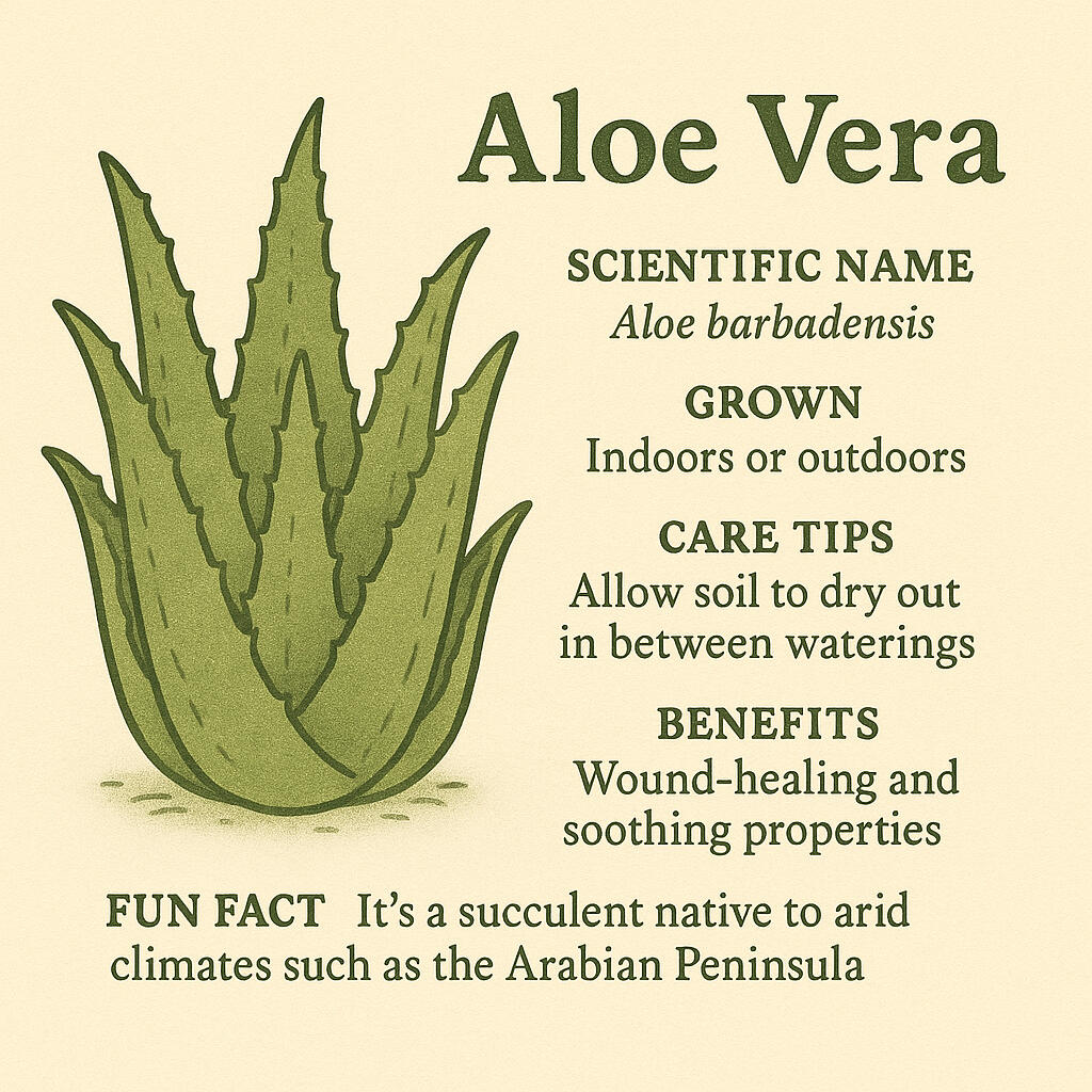 🌿 Day 1 – Plant of the Day🌵 Aloe Vera (Aloe barbadensis)Where It Grows Best:Aloe is a sun-loving succulent that thrives both indoors and outdoors. It prefers warm temperatures, bright indirect light, and soil that dries out completely between waterings.Care Tips:Water deeply but infrequently.Use cactus or succulent soil.Keep it near a sunny window or on a porch where it won’t freeze.Health Benefits:Known for its soothing gel, Aloe helps with sunburn, minor cuts, and skin irritation.It also has mild antibacterial and anti-inflammatory properties.🌟 Fun Fact:Aloe vera is native to arid regions like the Arabian Peninsula and has been used medicinally for over 6,000 years. Ancient Egyptians called it the "plant of immortality."